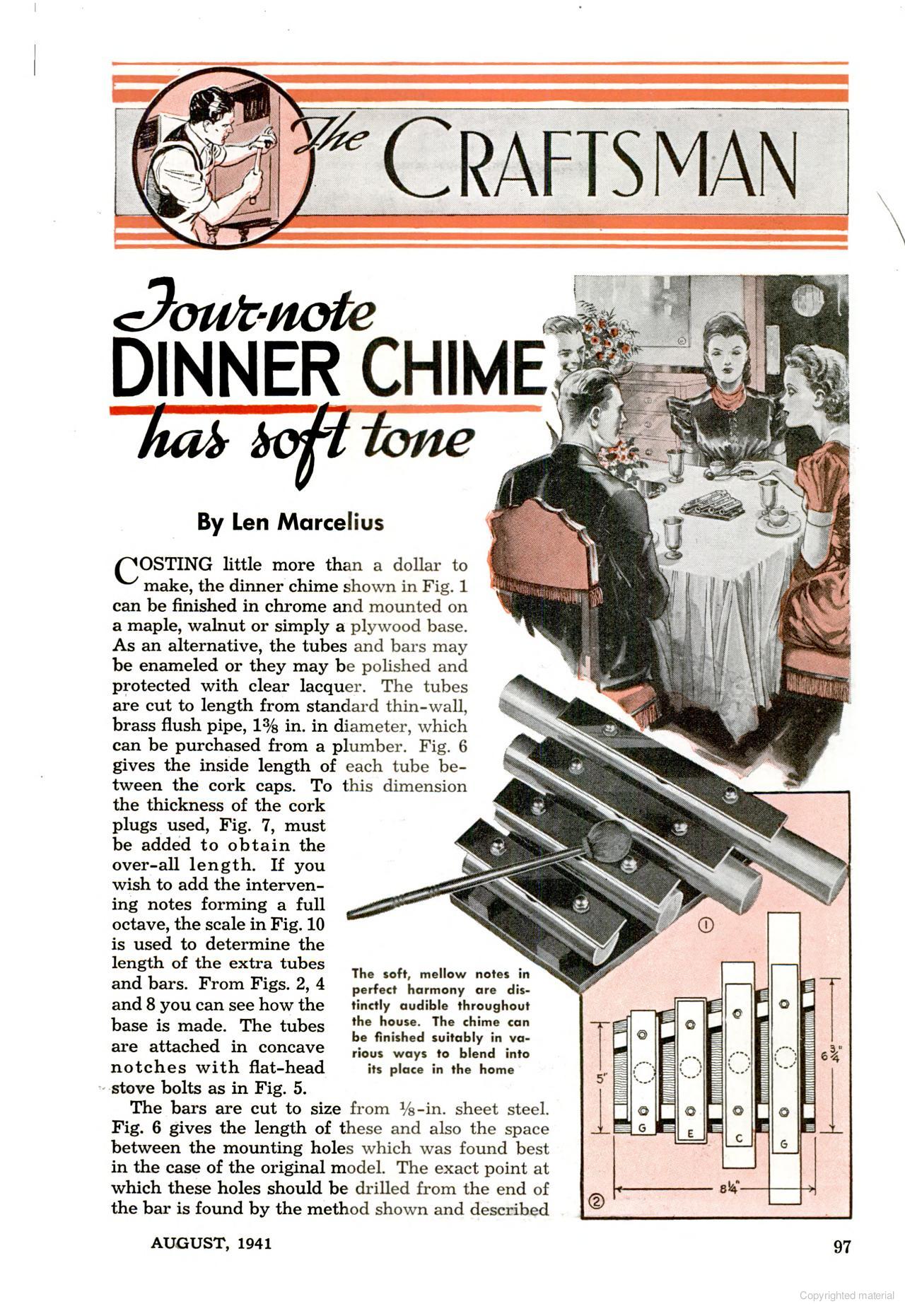 T he august, 1941 issue of Popular Mechanics included a guide to building your own four bar, four tube dinner chime. This appears to be almost identically modeled after the Deagan Model 200 chime, except it contains a backplate attached to the chime tube support rails, and the resonator tubes are attached to the rails rather than being inserted through them. This article appeared a couple of years before the expiration of the 1926 patent below, thus it was probably altered ever so slightly to avoid infringement.